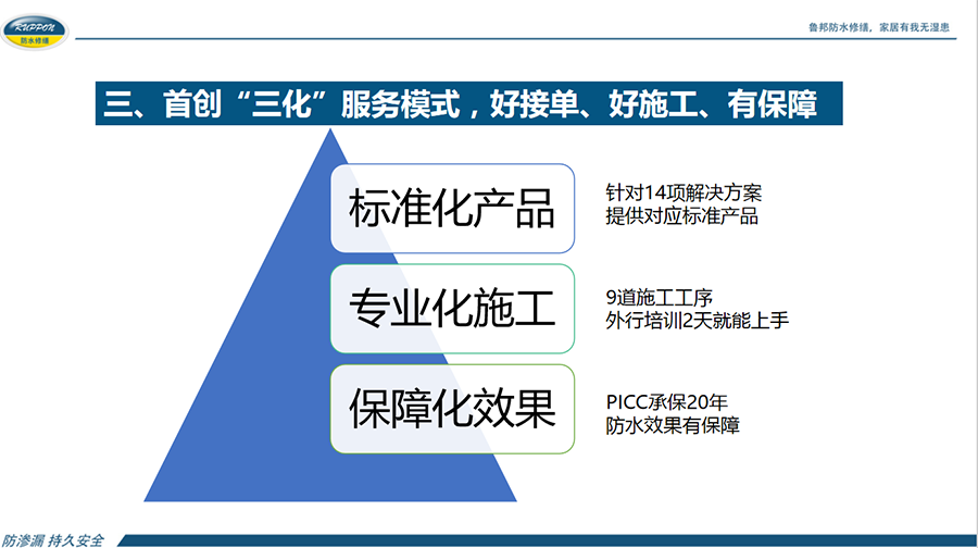 中國物業(yè)管理協(xié)會,在協(xié)助政府制定行業(yè)改革方案、發(fā)展規(guī)劃、產(chǎn)業(yè)政策等方面發(fā)揮重要作用并設(shè)有物業(yè)維修資金研究專業(yè)委員會。湖北魯邦建材股份有限公司在全國率先成立魯邦防水修繕服務(wù)中心,緊緊圍繞老城區(qū)、老小區(qū)作房屋防水修繕服務(wù),切實的為廣大居民解決生活煩惱且協(xié)助物業(yè)公司與居民構(gòu)建了和諧關(guān)系。探索出了一套具有魯邦特色、可持續(xù)發(fā)展的商業(yè)模式,得到物業(yè)行業(yè)的認可。幾年來,全國多地知名物業(yè)企業(yè)紛紛前來考察交流,提升了魯邦防水修繕服務(wù)中心行業(yè)對外形象。魯邦防水修繕服務(wù)中心在全國舊房防水修繕市場環(huán)境下成長為知名品牌企業(yè),建立了“三化”服務(wù)模式對行業(yè)更具有起到了帶好頭的榜樣。